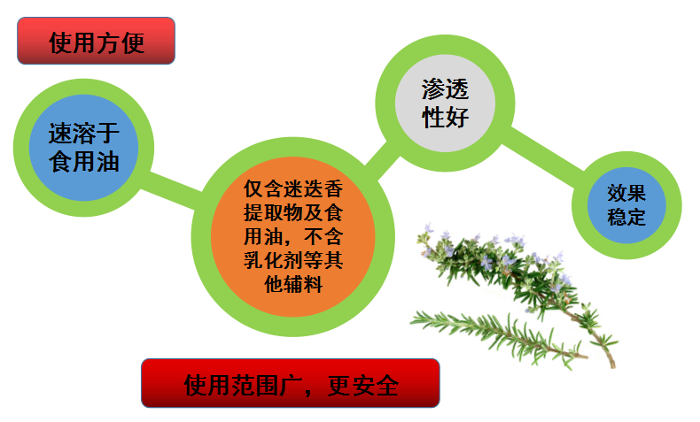 天然來源的迷迭香無毒、氣味芳香、抗菌,且抗氧化功效遠(yuǎn)遠(yuǎn)高于現(xiàn)有的VC、VE、茶多酚等天然抗氧化劑,是人工合成抗氧化劑BHA、BHT的2到4倍,其結(jié)構(gòu)穩(wěn)定、不易分解,可耐190℃至240℃高溫,徹底克服了VC、茶多酚等大多數(shù)天然抗氧化劑遇高溫分解這一致命弱點(diǎn),故相比其他同類產(chǎn)品,它更加高效廣譜,獨(dú)具優(yōu)勢。
