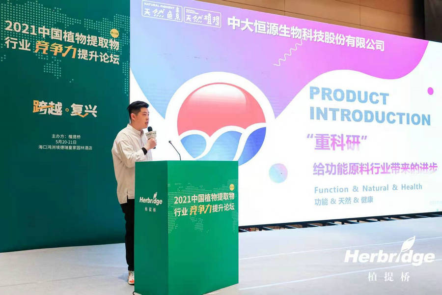 2021年5月20-21日第12屆中國植物提取物行業(yè)競爭力提升論壇在??谑信e行,河南中大恒源生物科技股份有限公司銷售總經(jīng)理金子恒應(yīng)邀參會,并在論壇作了《“重科技”給功能原料行業(yè)帶來的進(jìn)步》主題演講,引發(fā)與會人員的廣泛關(guān)注。