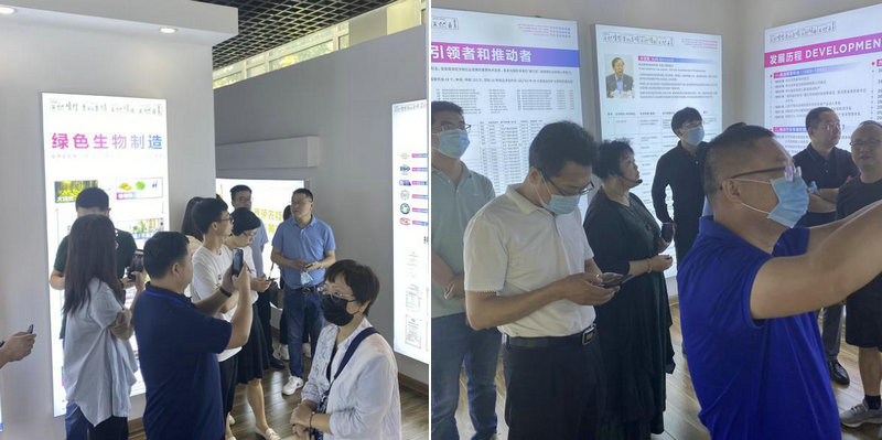 In the green biological manufacturing exhibition hall, the guests at the meeting showed great interest in the company's green recycling development model and took photos.