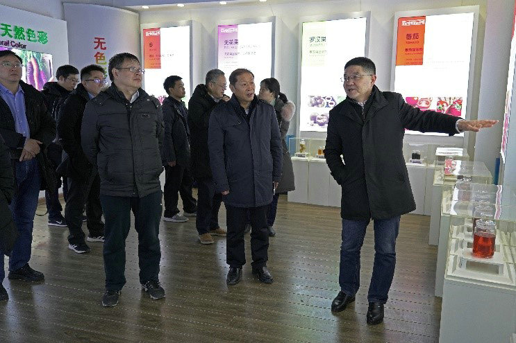 考察團(tuán)一路風(fēng)塵仆仆,沒有多余的寒暄,沒有片刻的歇息,就在李總的帶領(lǐng)下來到中大恒源“中國天然植物提取體驗(yàn)館”參觀。李總首先介紹了中大恒源的原料生產(chǎn)基地、天然色素、天然健康提取物、天然香精香料、生物替抗、植物染料等天然植物提取系列產(chǎn)品,看著色彩斑斕、琳瑯滿目的產(chǎn)品,令長期奮斗在教學(xué)科研第一線的專家、教授們感到驚奇:“沒有想到一個企業(yè)能夠心系民族產(chǎn)業(yè),心系人類健康,把天然植物提取做得這么深、這么細(xì)、這么廣,真了不起!”